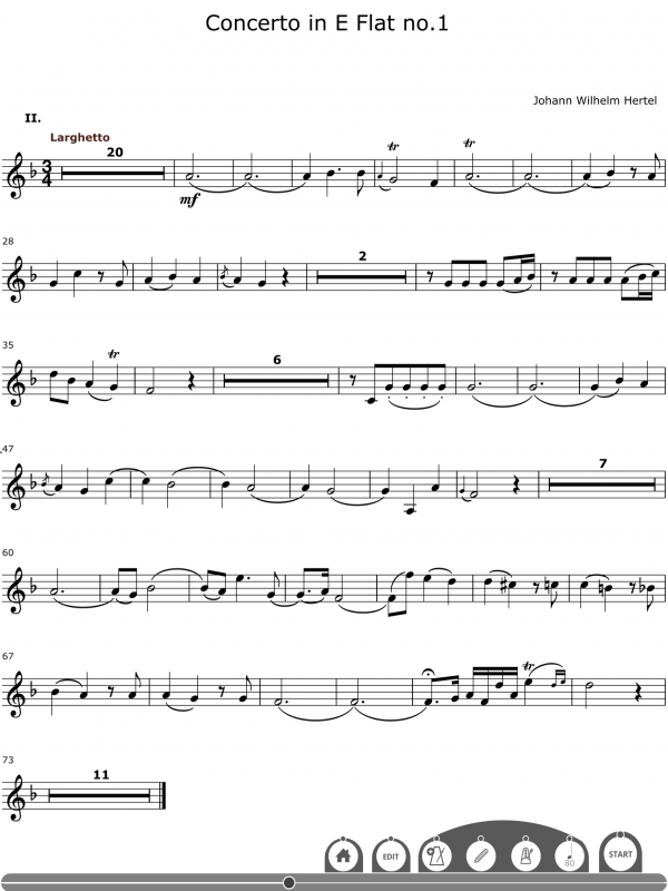 The first Hertel's trumpet concerto is composed in three movements, consisting of a slow movement framed by two fast ones. All of these movements have more or less the same form, with the end of the long introduction serving as the movement's conclusion. The present concerto is the most substantial of the three that Hertel composed. The long multipartite introduction contains the motifs which are worked on during the course of the firstmovement. Sprighty leaps, the execution of which is no mean feat on the natural trumpet, alternate with lines cantabile in nature. The concise second movement is one of the most beautiful slow movements in the entire trumpet literature. At the ends of the outer movements, the composer wrote particularly virtuoso flourishes which serve to replace cadenzas improvised by the soloist.